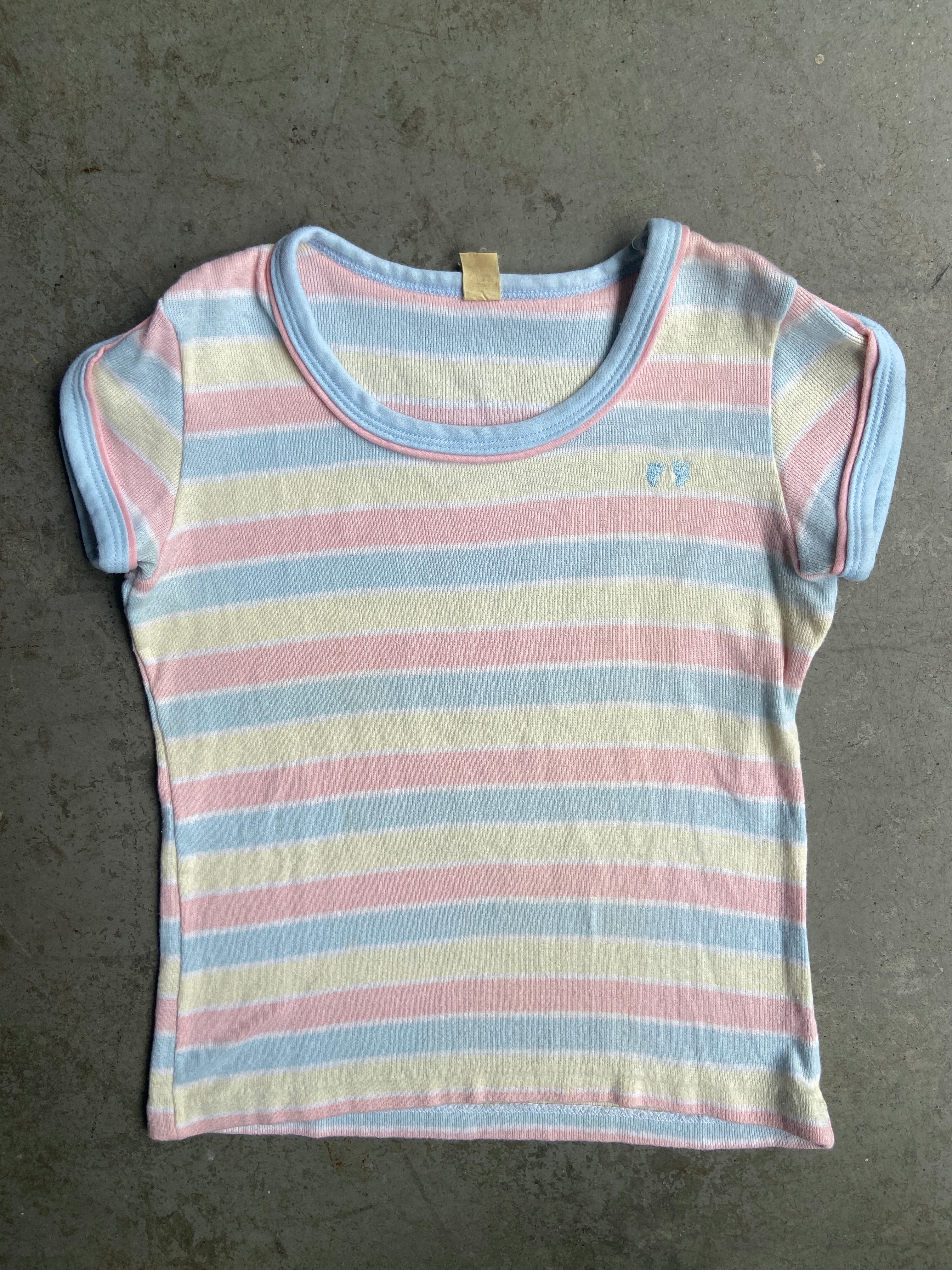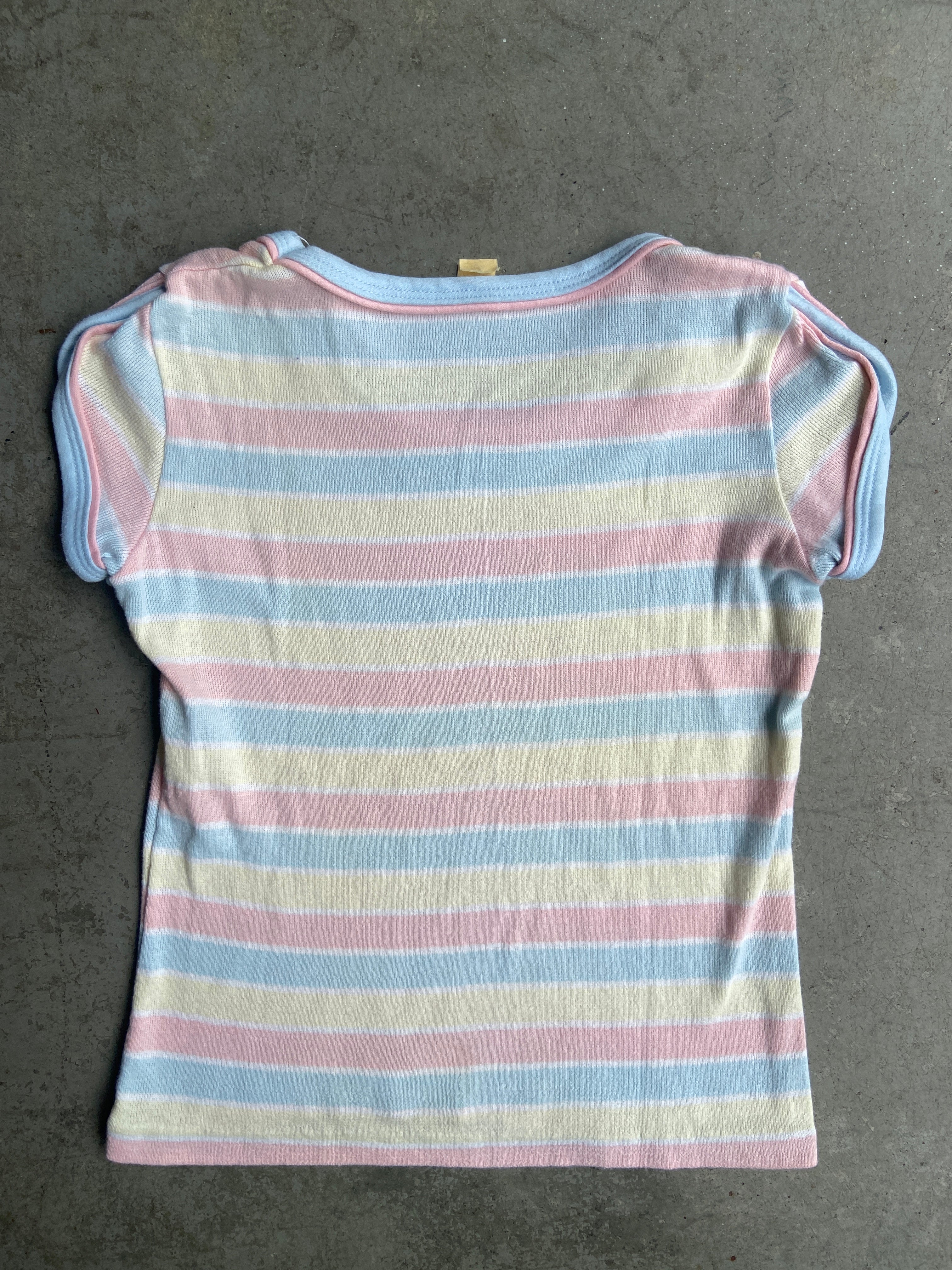 Channel true vintage surfer girl style in this 70s/80s Hang Ten tee, complete with pastel stripes and the iconic embroidered Hang Ten logo on the chest. With cute cap sleeves and a fitted cut, it's perfect for grabbing ice cream after long summer days.
