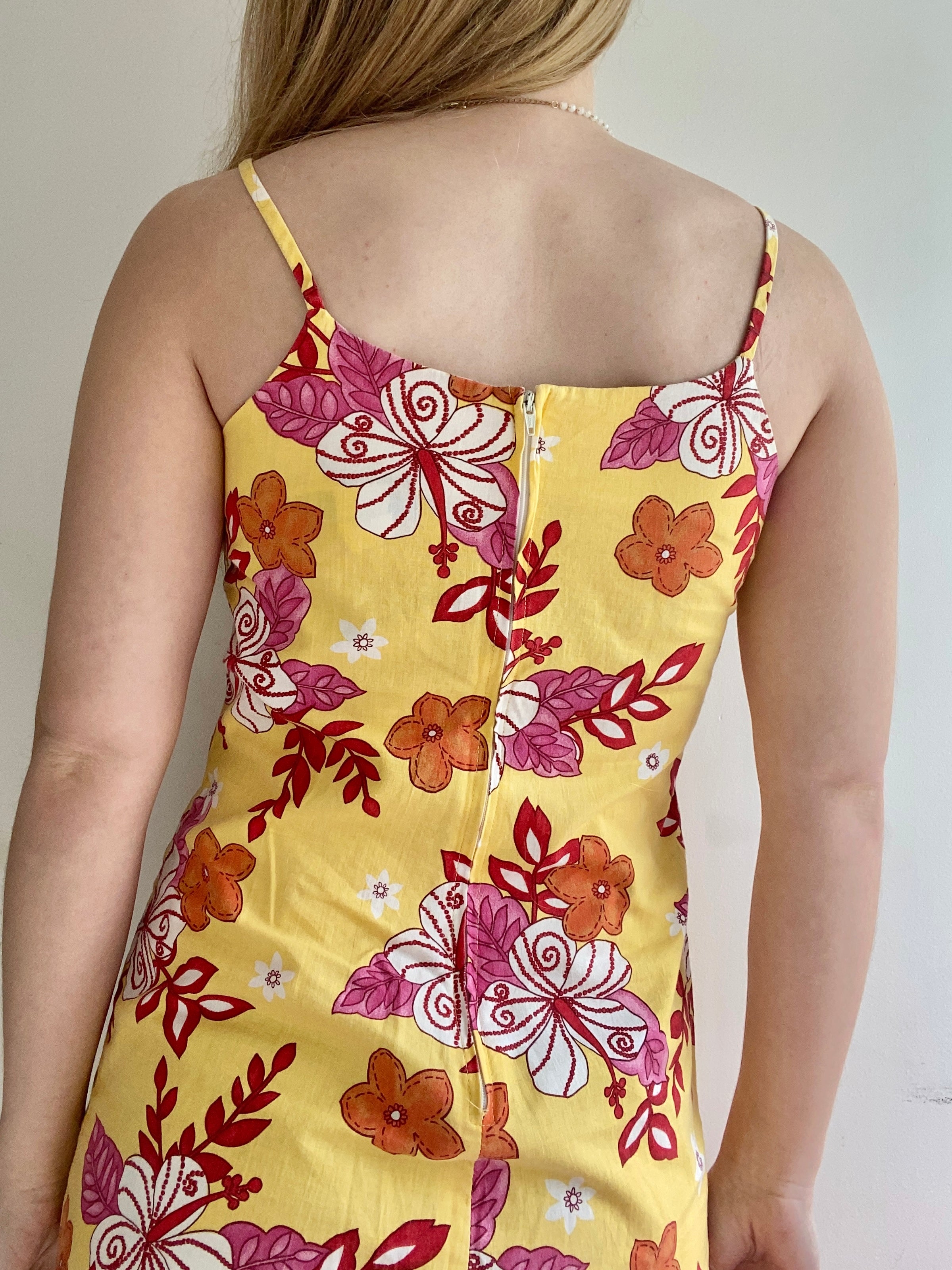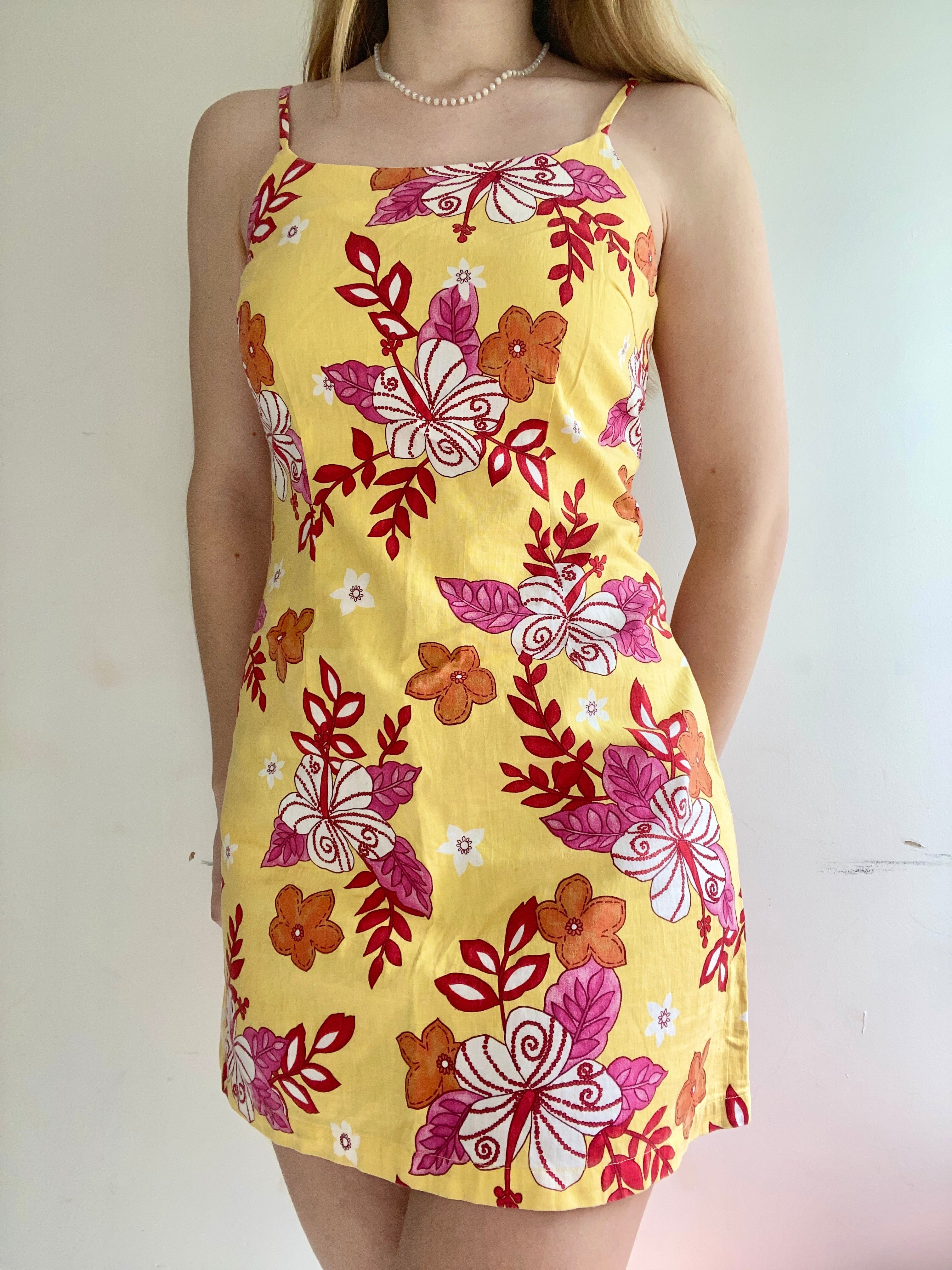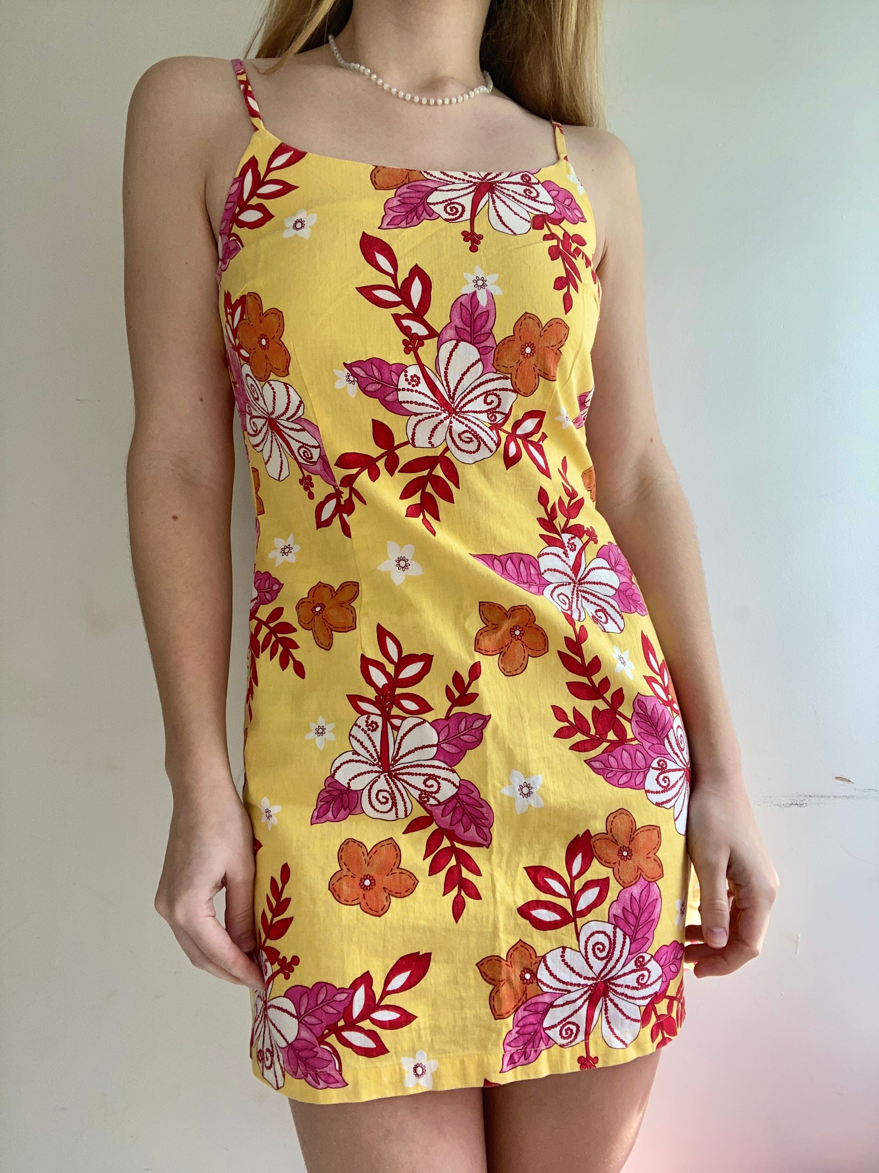 Perfect for beach days and tropical destinations, this 90s/early 2000s dress stands out in the coolest floral print and bright colors made for spring and summer. Would look amazing paired with some sandals for going out to dinner or exploring beach towns!