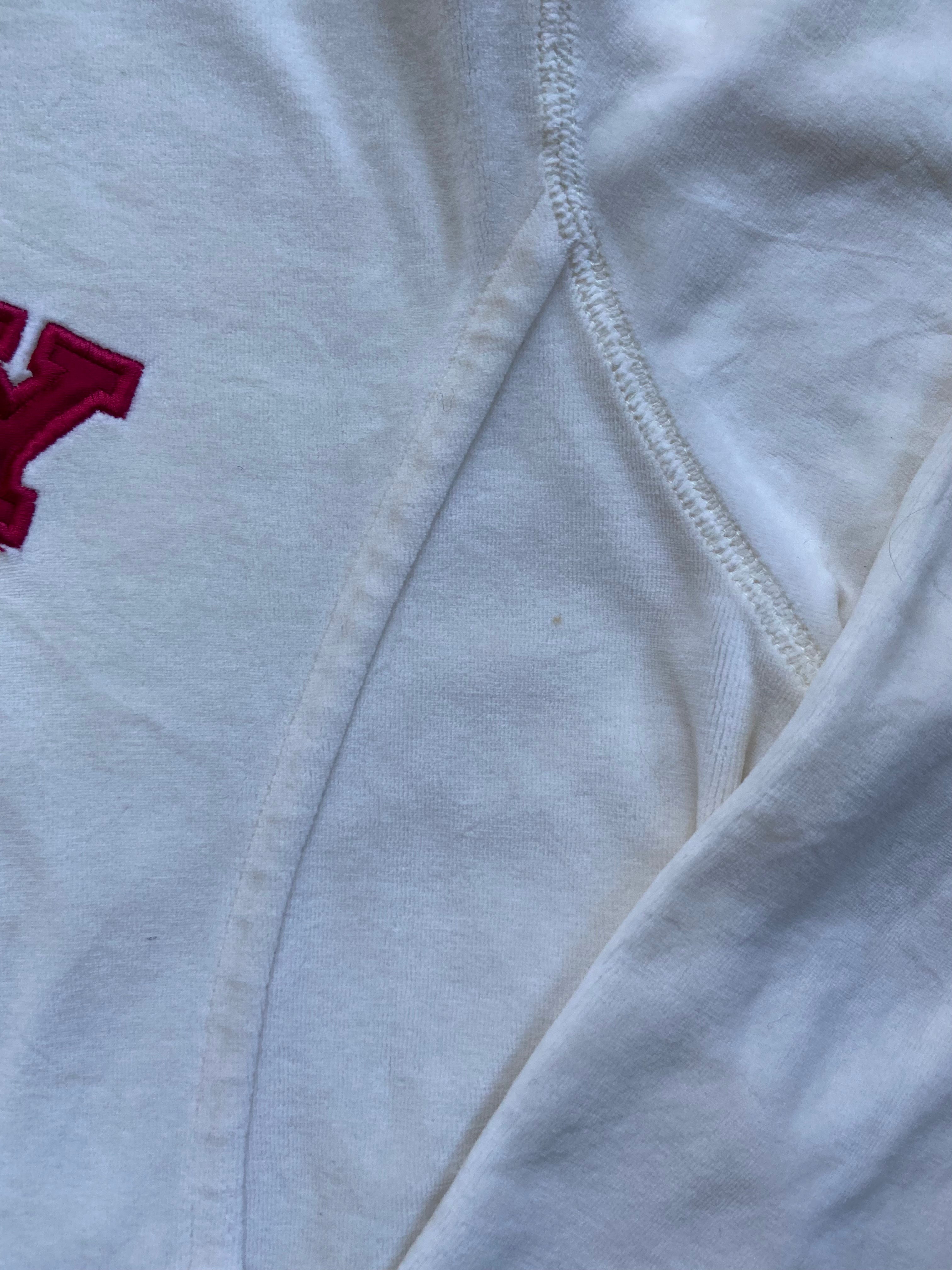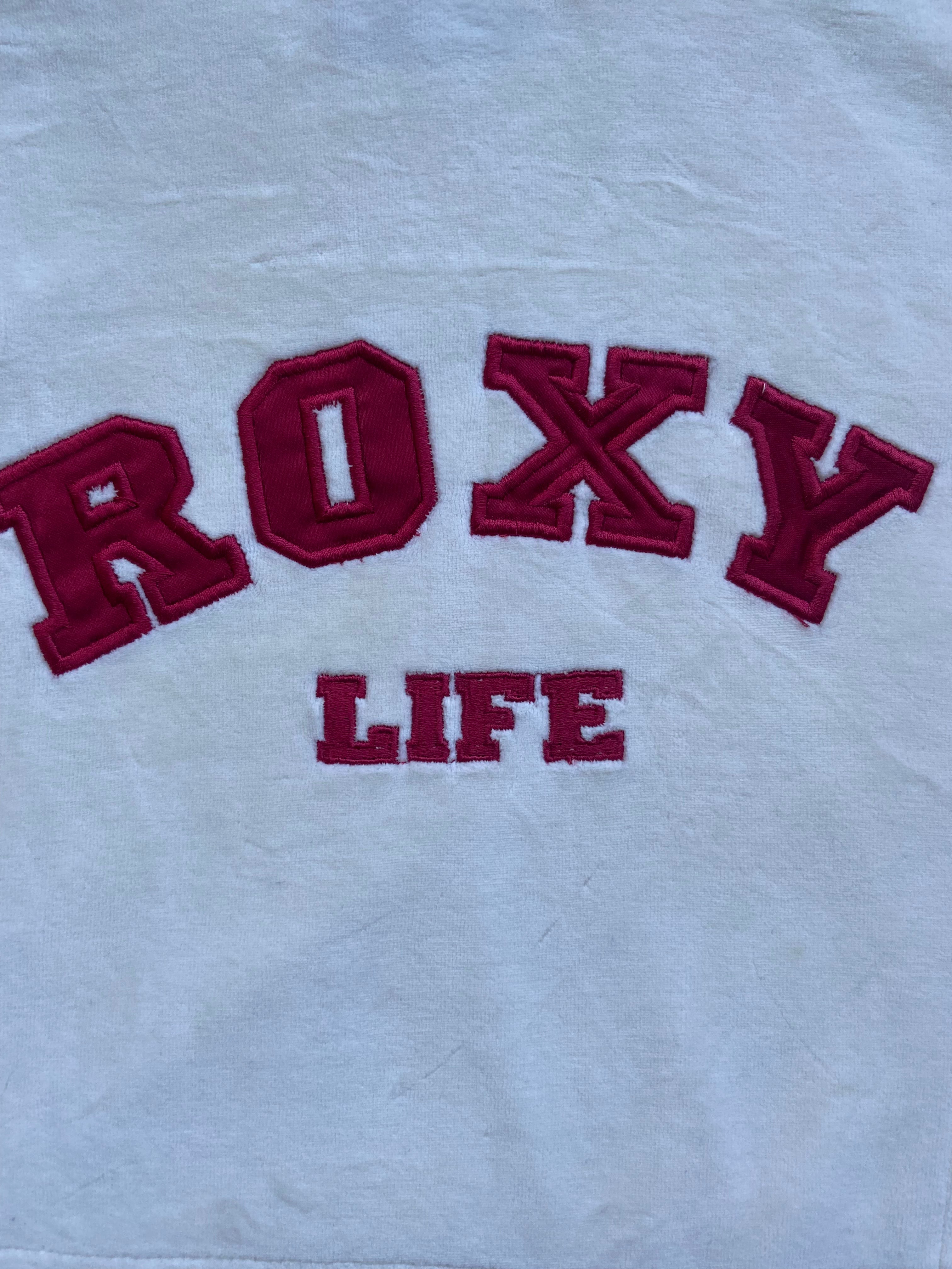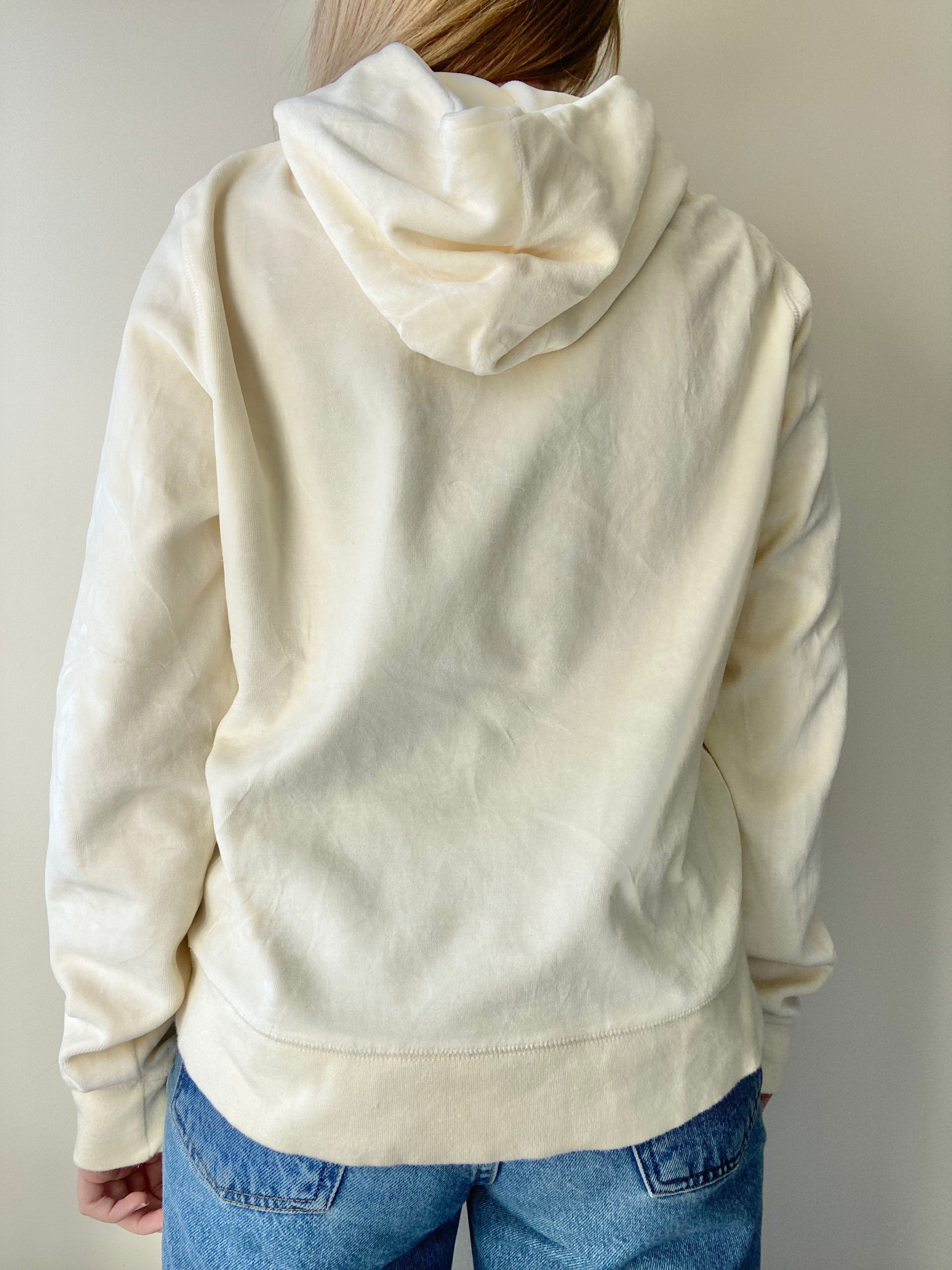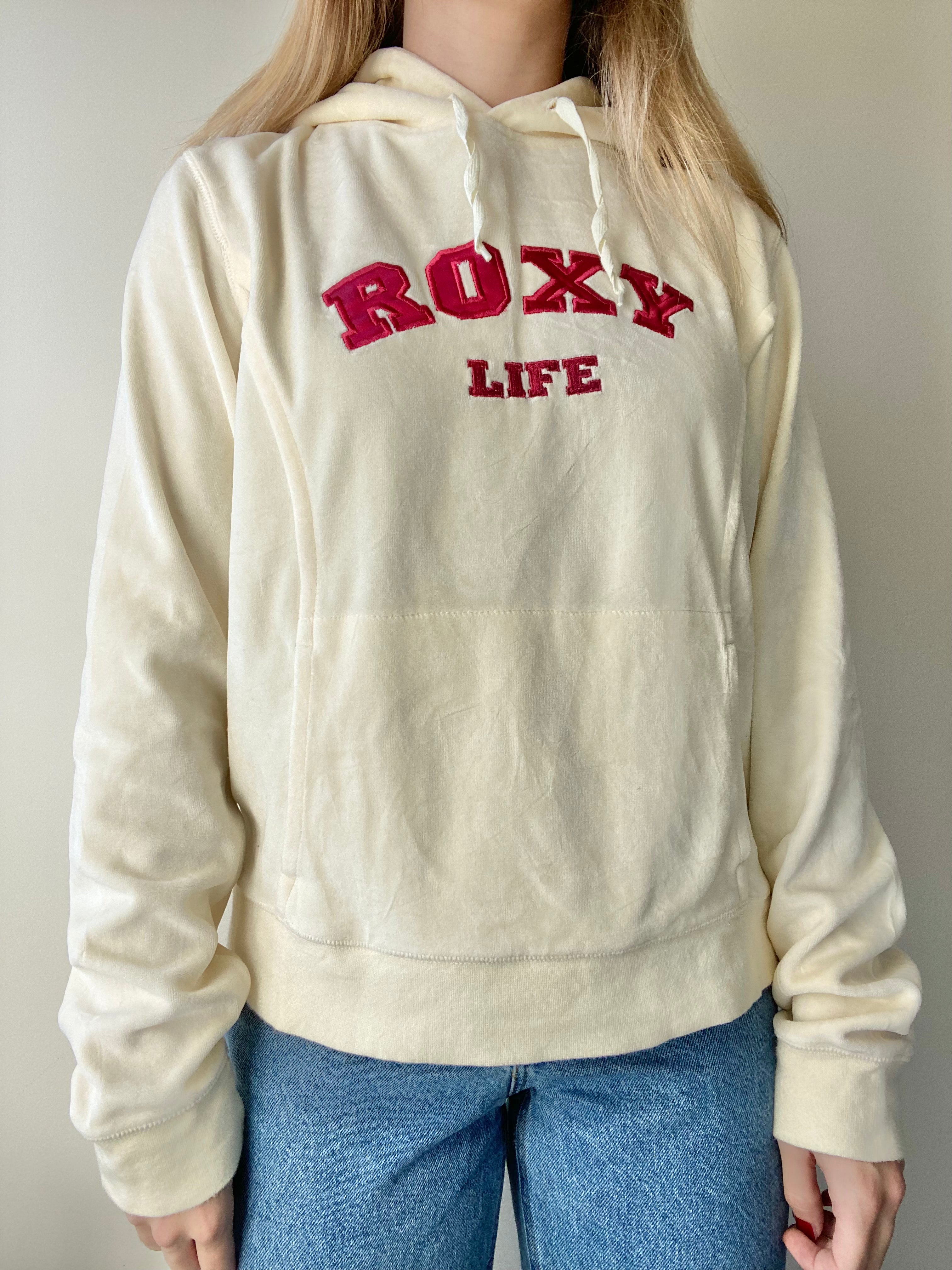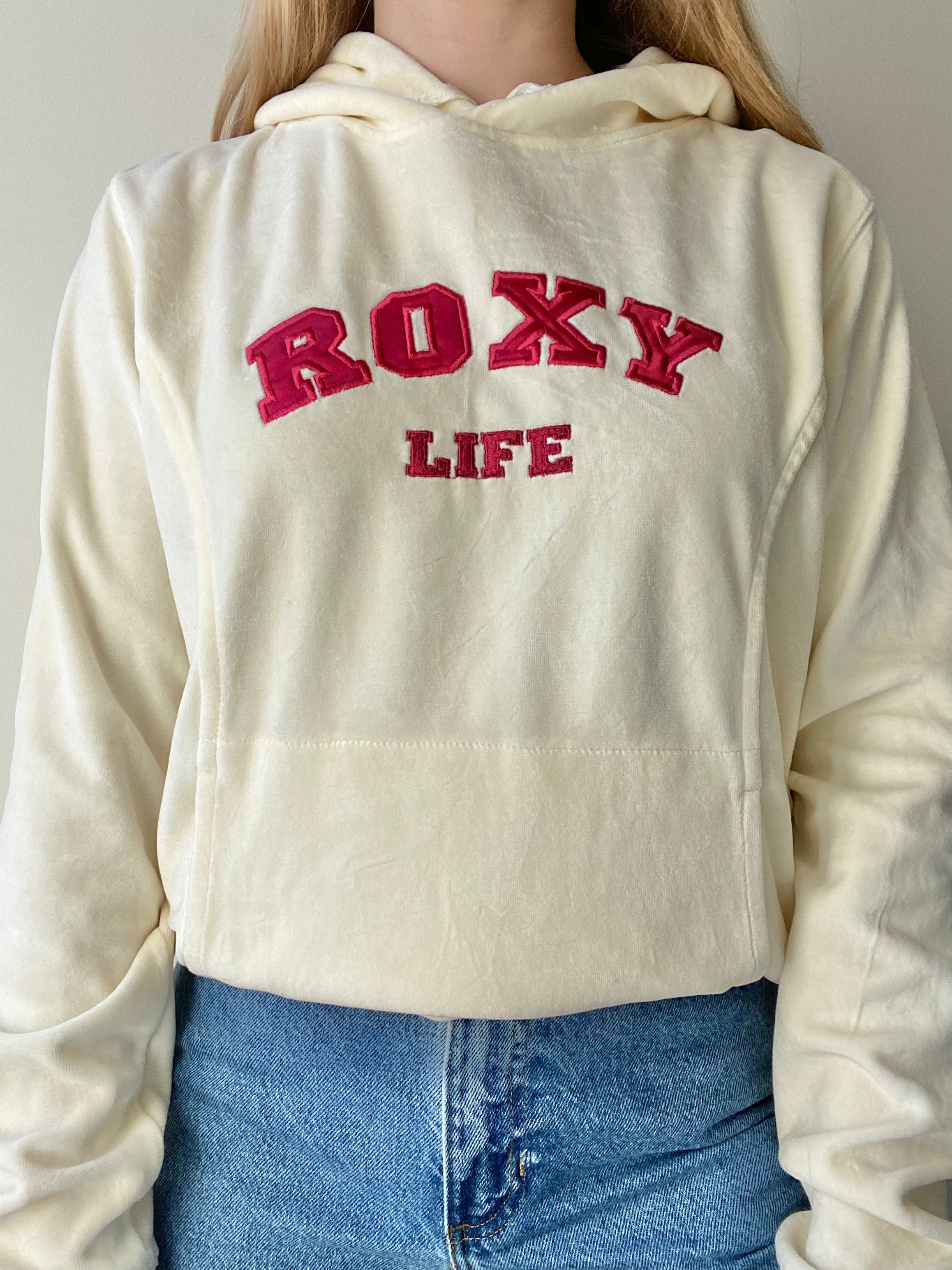 Y2K style isn't Y2K without some velour. This 90s Roxy hoodie has everything from a beautiful cream and red colorway, to stand-out lettering, to iconic velour fabric for a truly nostalgic early 2000s surfer girl style. Throw this one on and have a Blue Crush movie marathon.