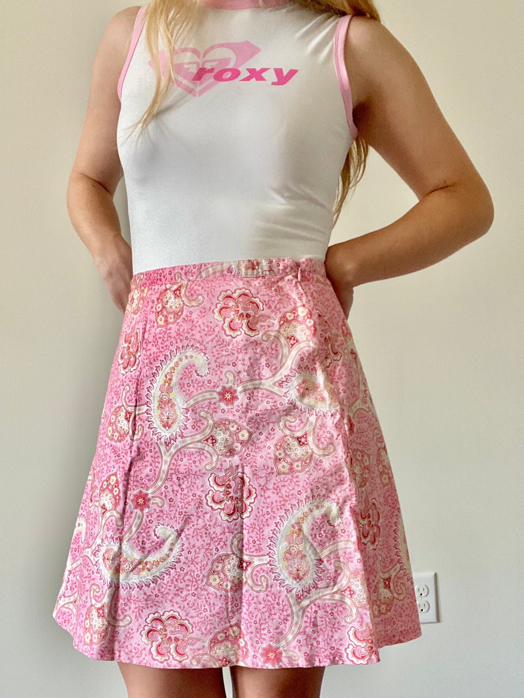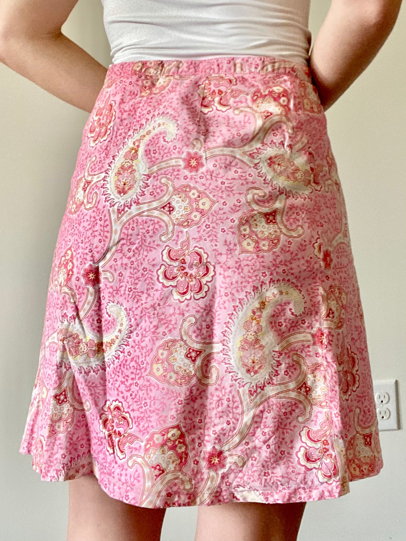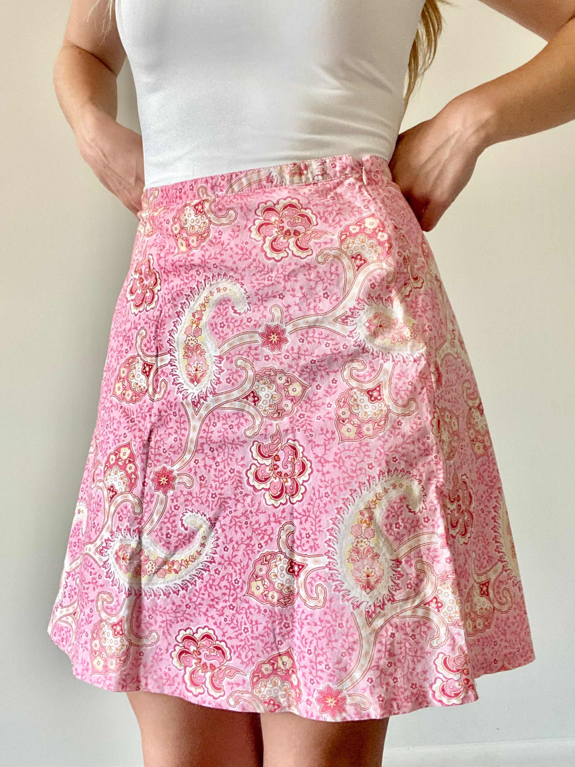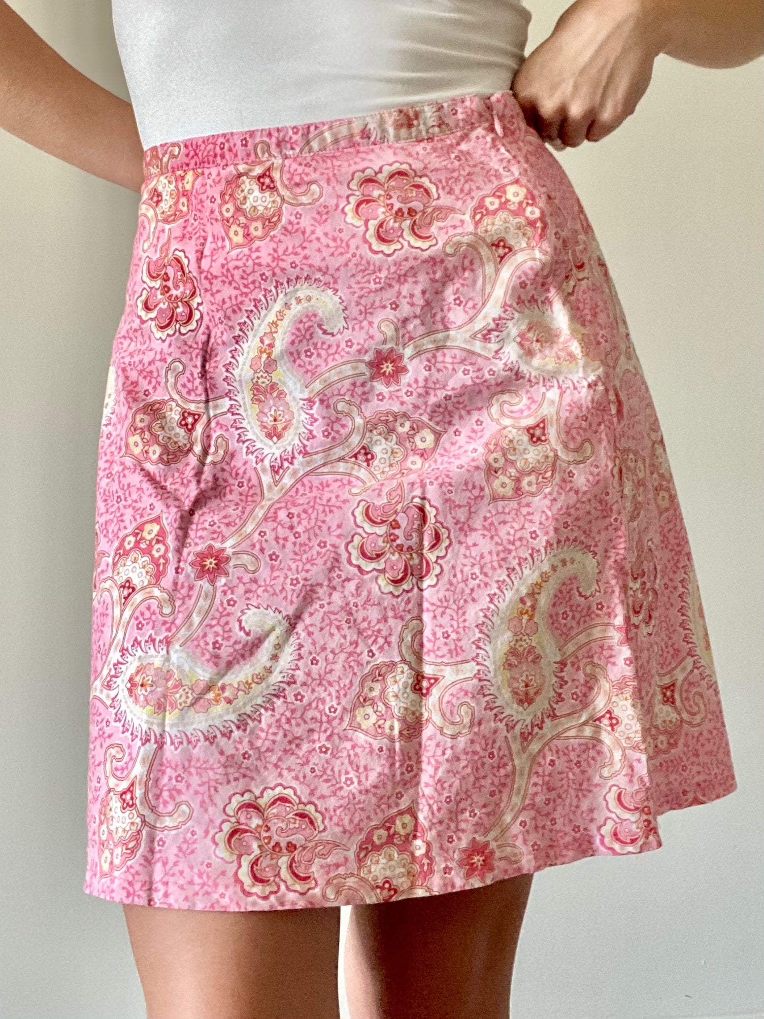 Early 2000s Tommy Hilfiger paisley print skirt! Flirty pink, white, and yellow florals make this one such a good option for spring and summer outfits. Side zipper and double lined. Pairs best with a picnic in the park and 70s vibes.