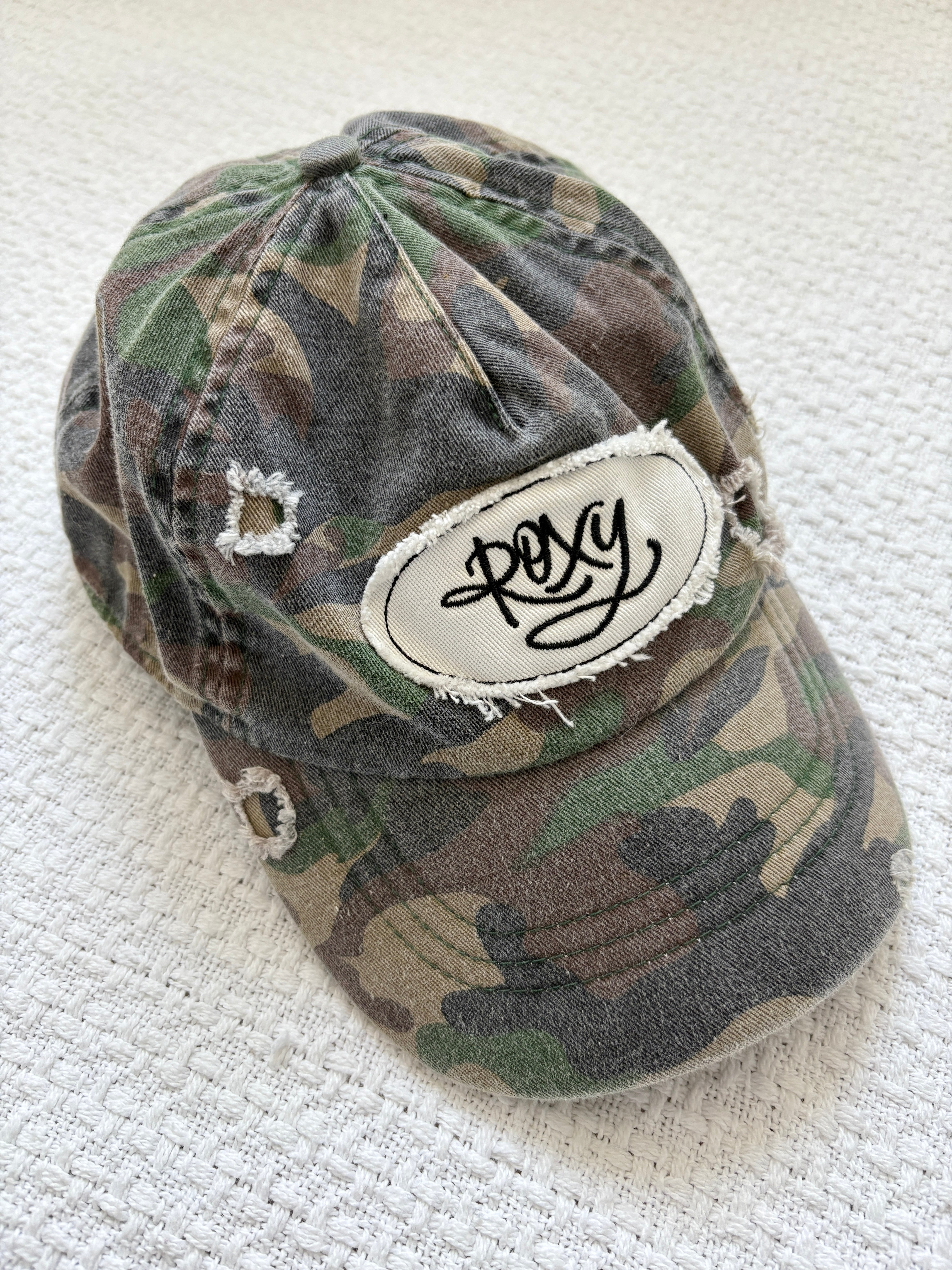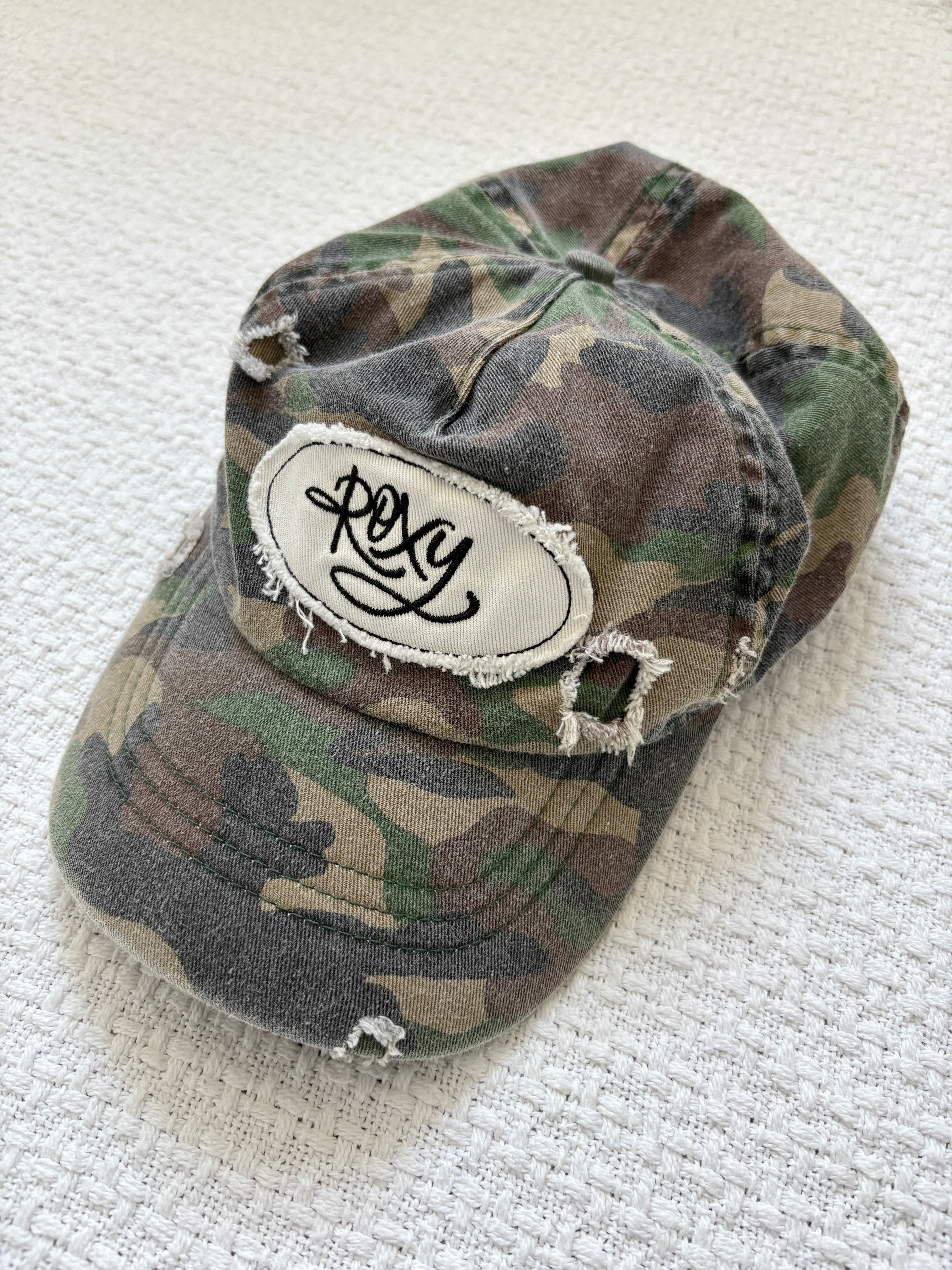 A true 2000s piece. You can’t go wrong with distressed camo, and this Roxy cap looks good with everything to keep your outfits cool and casual. Love the distressing and embroidered logo front and center.