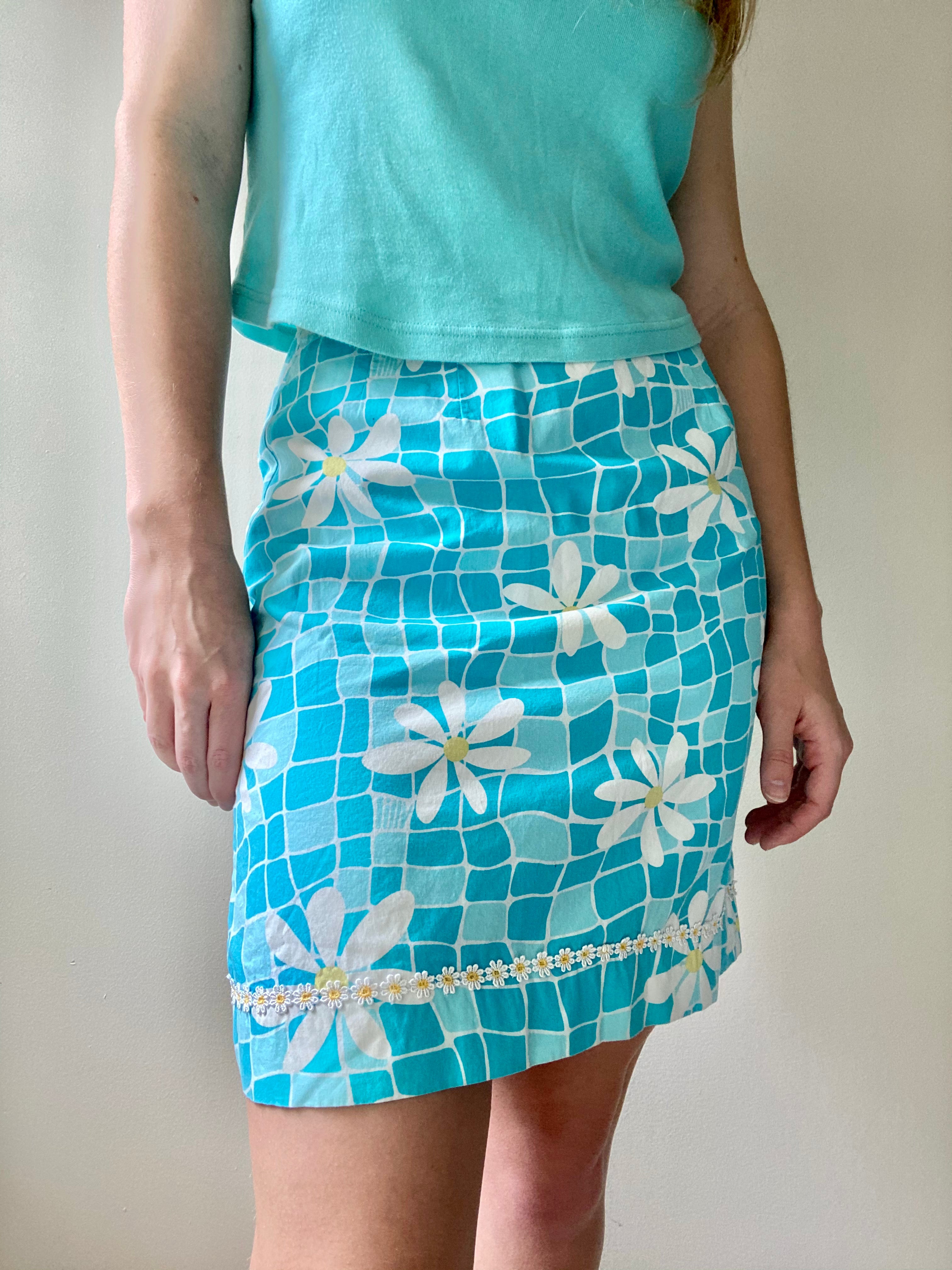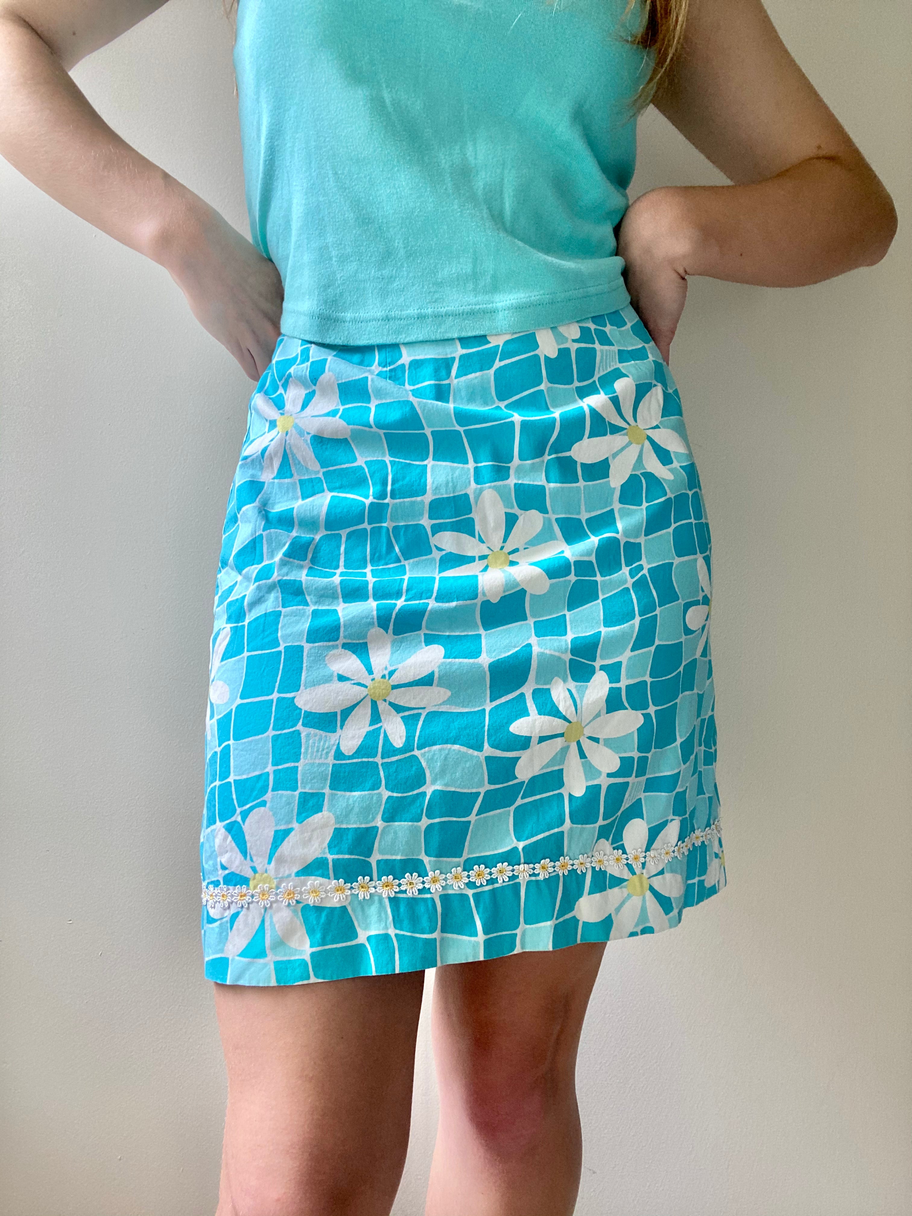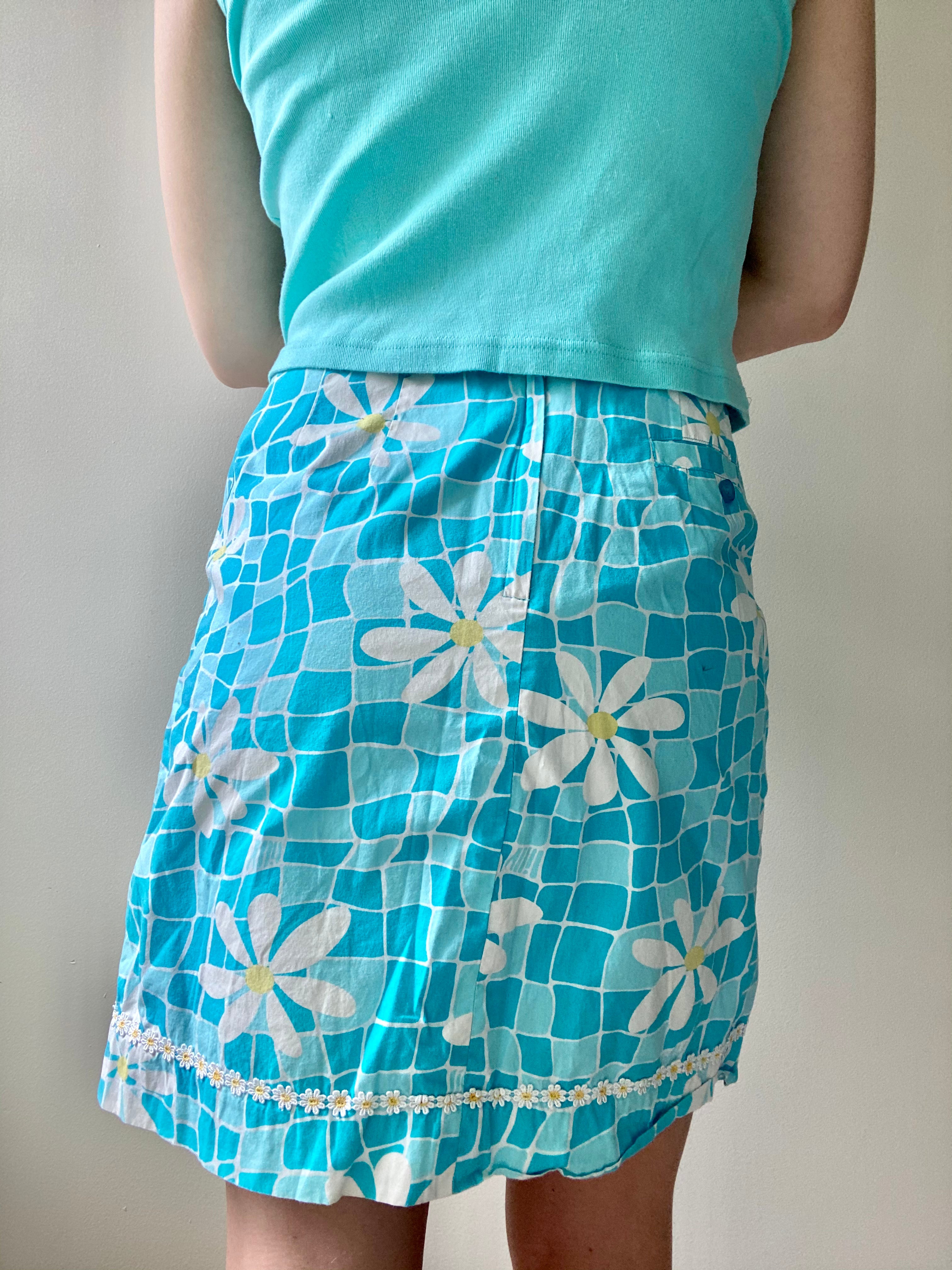 Straight from the 90s/early 2000s, this vintage Lilly Pulitzer skirt will have you dreaming of days by the water. Such a cool print that looks like daisies floating on the surface of a swimming pool. Never seen a print like this one before, and its vintage quality makes this one a rare piece you'll want to wear over and over.
