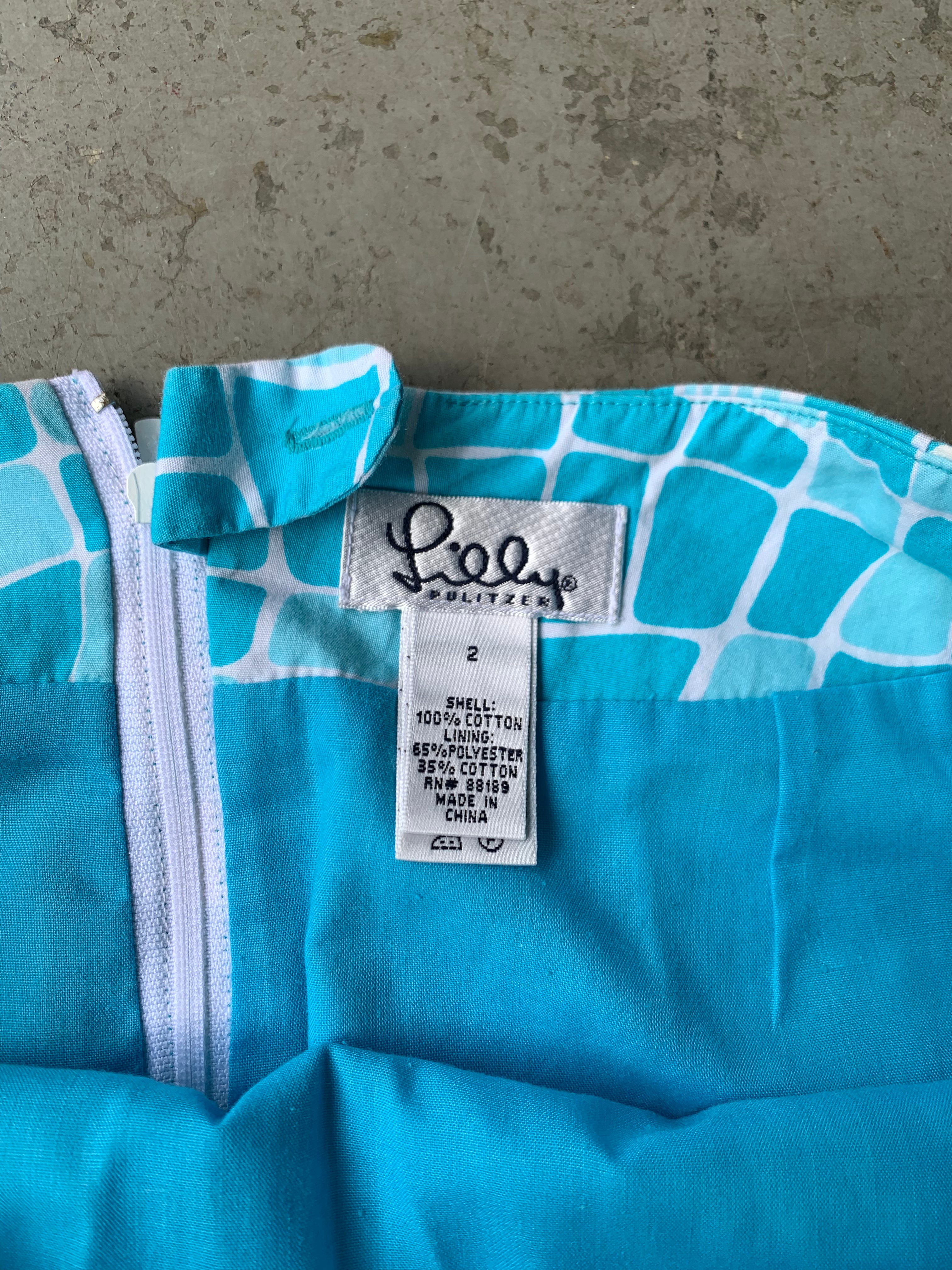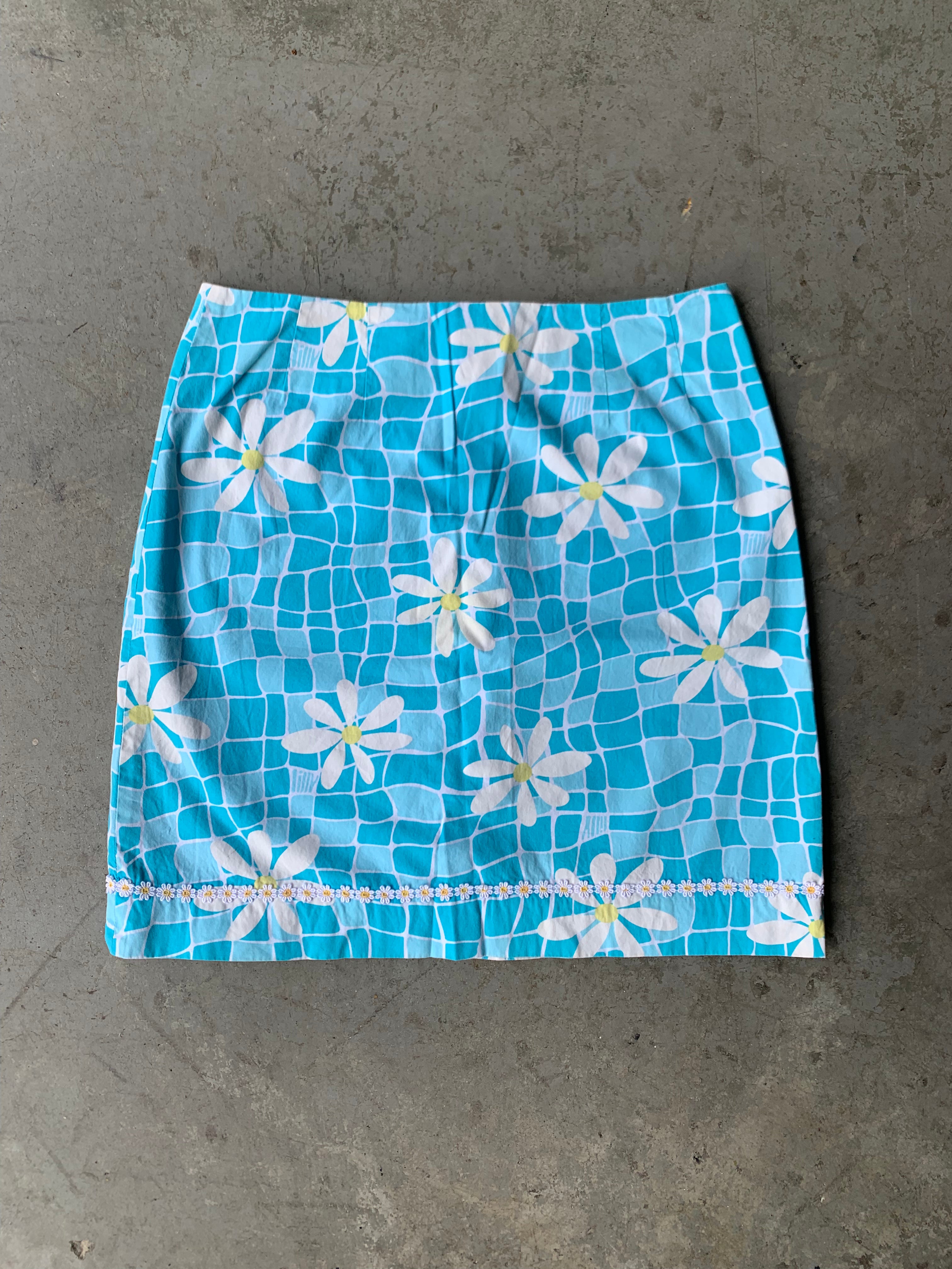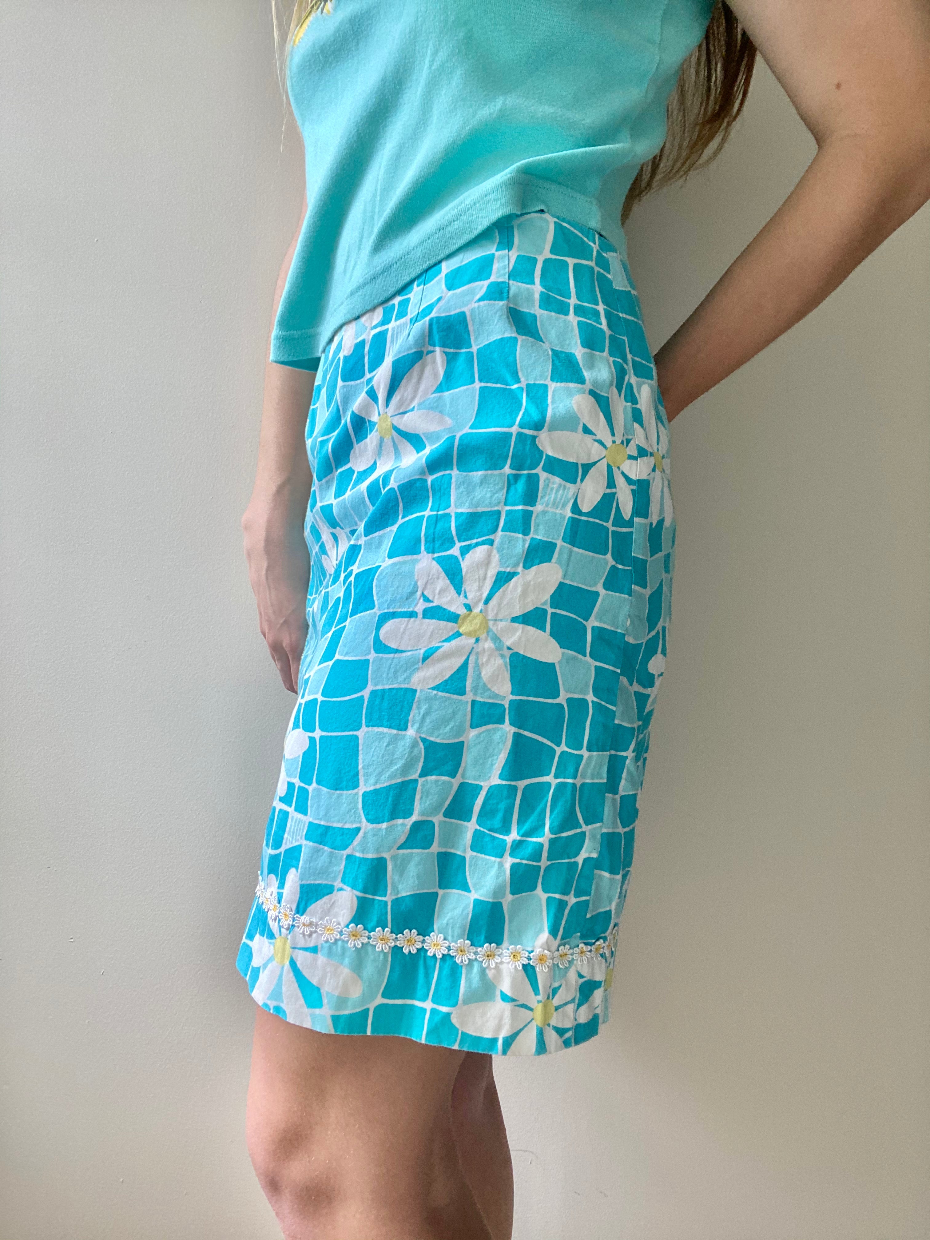 Straight from the 90s/early 2000s, this vintage Lilly Pulitzer skirt will have you dreaming of days by the water. Such a cool print that looks like daisies floating on the surface of a swimming pool. Never seen a print like this one before, and its vintage quality makes this one a rare piece you'll want to wear over and over.