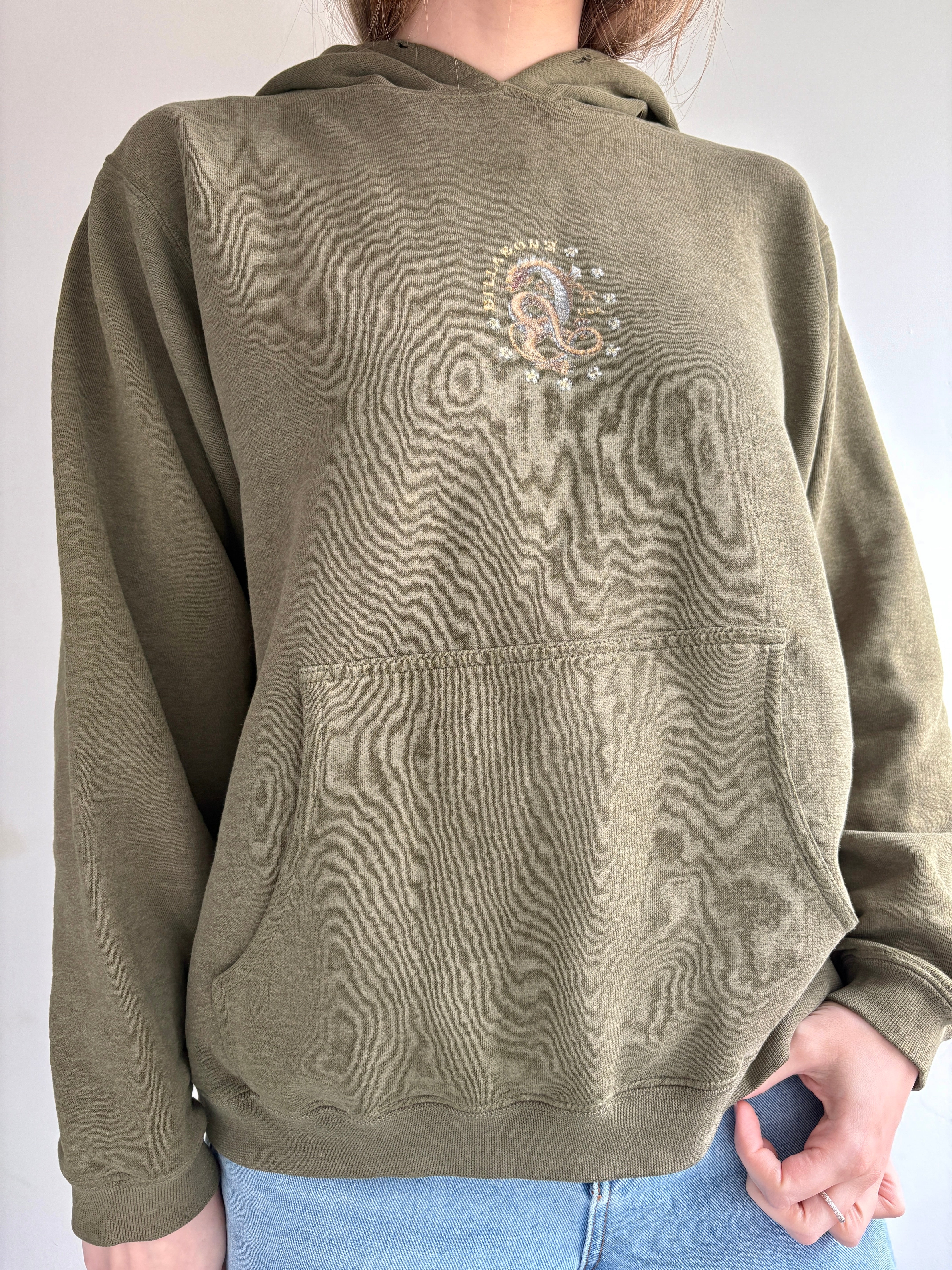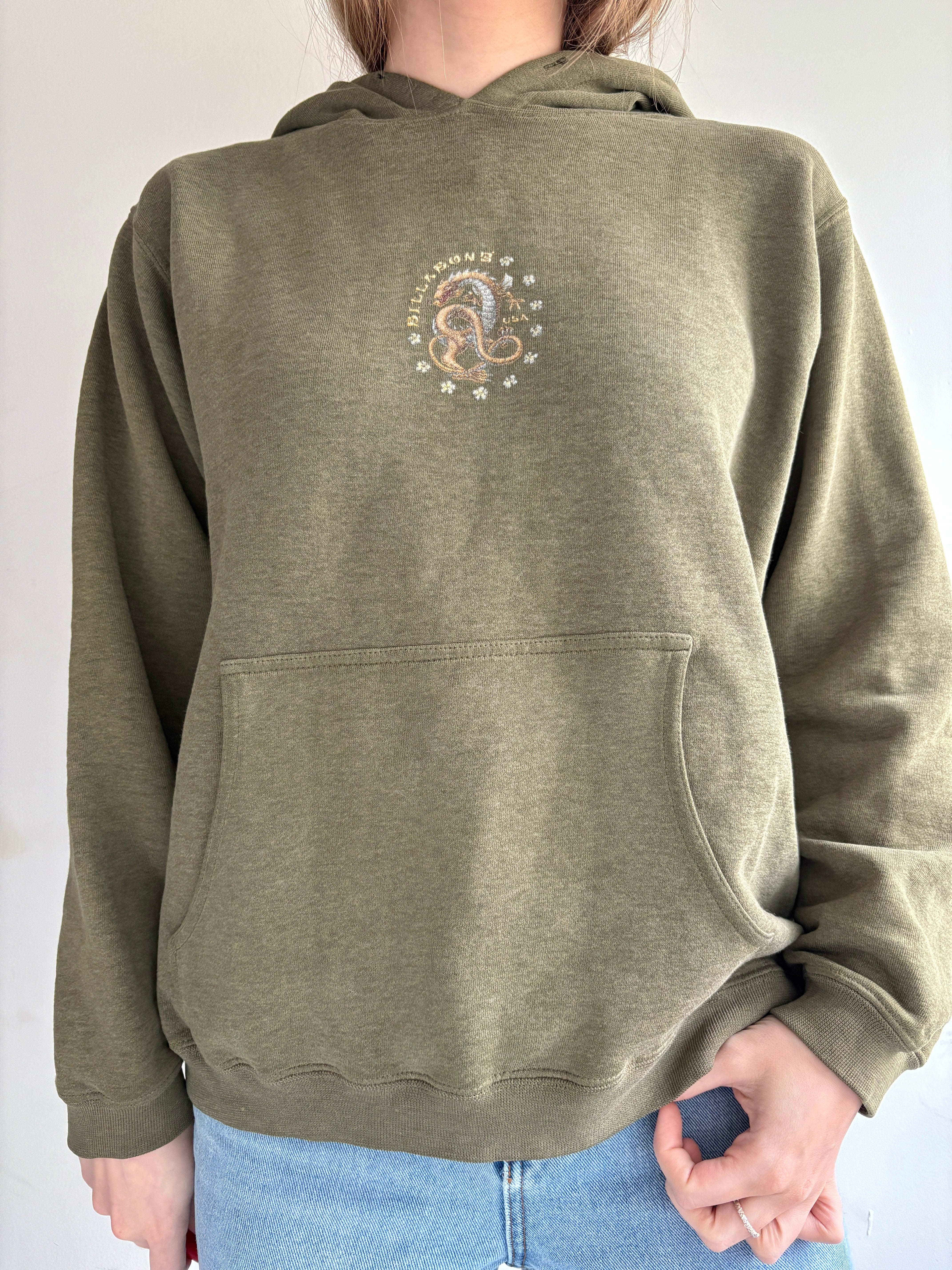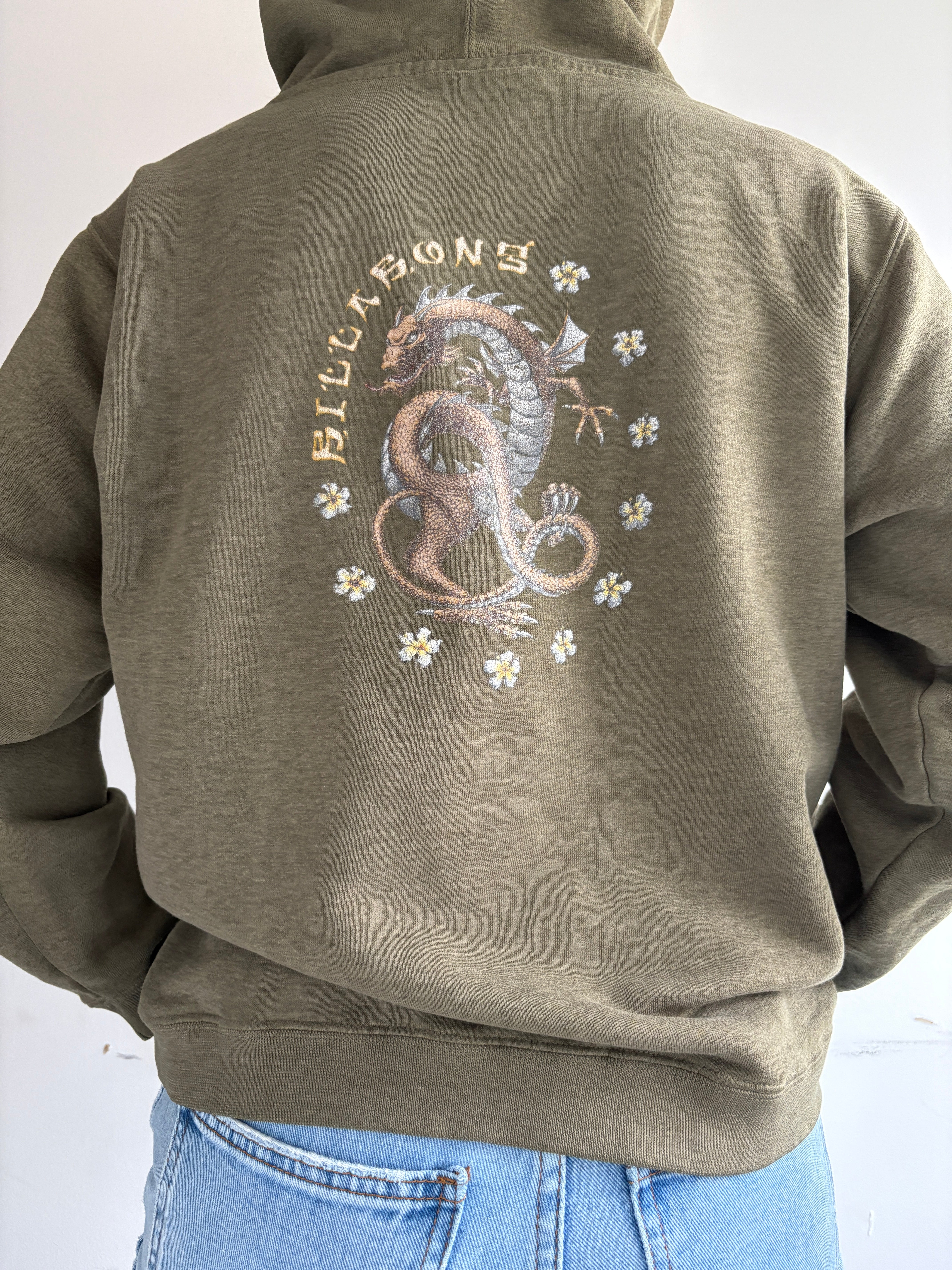 Another awesome Billabong piece for the true vintage surf collectors. This vintage 90s Billabong dragon hoodie features awesome graphics on the front and back, all in amazing condition. One of the brand’s rarer designs, you won’t see this hoodie in anyone else’s collection. In nearly perfect condition (just missing the drawstring!)